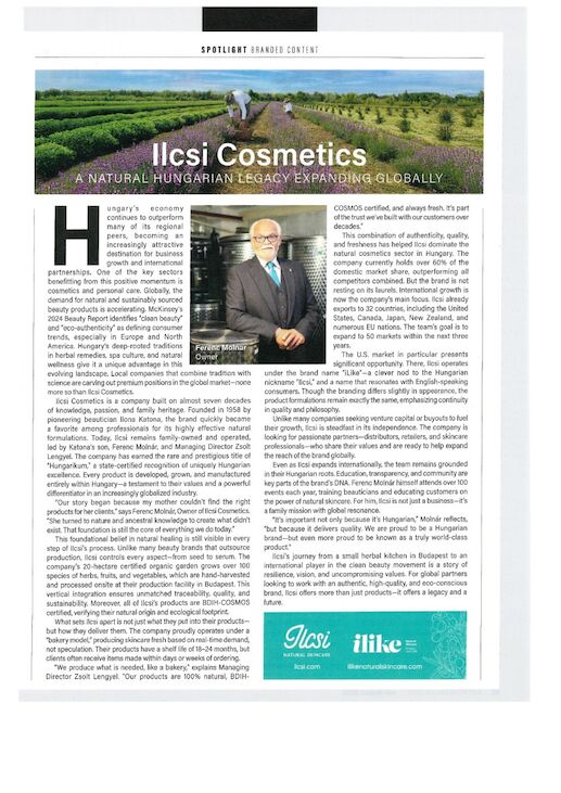 From "Entrepreneur July-August 2025 - Hungary’s economy continues to outperform many of its regional peers, becoming an increasingly attractive destination for business growth and international partnerships. One of the key sectors benefitting from this positive momentum is cosmetics and personal care. Globally, the demand for natural and sustainably sourced beauty products is accelerating. McKinsey’s 2024 Beauty Report identifies “clean beauty” and “eco-authenticity” as defining consumer trends, especially in Europe and North America. Hungary’s deep-rooted traditions in herbal remedies, spa culture, and natural wellness give it a unique advantage in this evolving landscape. Local companies that combine tradition with science are carving out premium positions in the global market—none more so than Ilcsi Cosmetics.